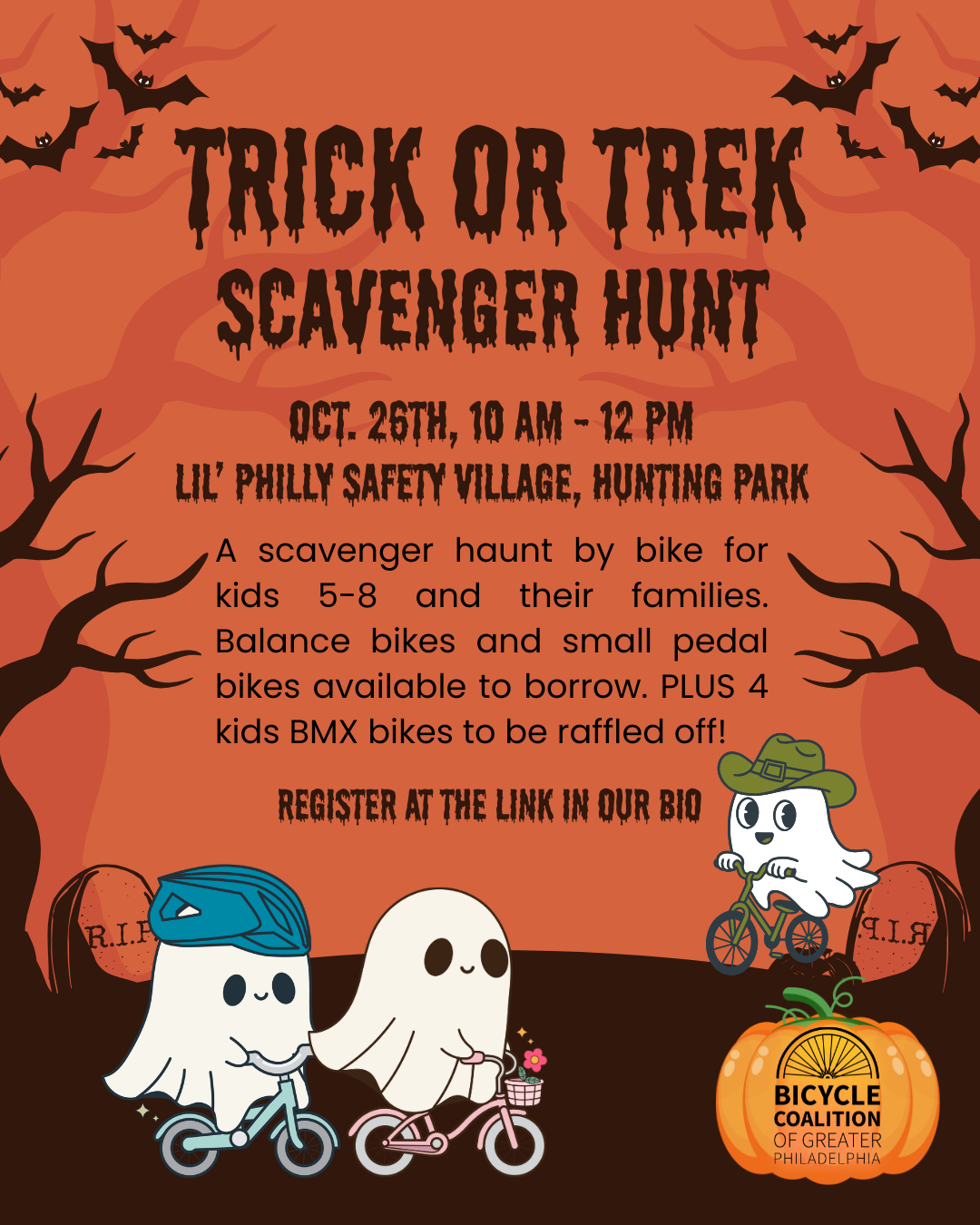 Join the Bicycle Coalition of Greater Philadelphia (BCGP) for their pre-Halloween bike scavenger “haunt” excursion at the Lil Safety Village in Hunting Park. Kids aged 5 to 8 years old will have the opportunity to use their balance bikes or small pedal bikes to scavenge for candy and find bike essentials in key locations in Hunting Park with their friends and family. At the end of the event, BCGP will be raffling off four BMX bikes for kids to take home. (Note: you must participate in the scavenger “haunt” to qualify for the bike raffle)