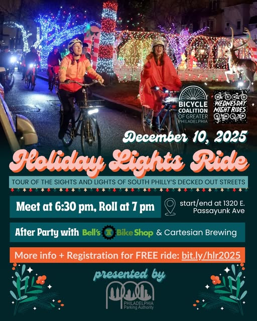 Cartesian Brewing 1326 East Passyunk Avenue, Philadelphia, PA, United StatesThe Bicycle Coalition of Greater Philadelphia's annual critical mass bike ride and celebration in partnership with Wednesday Night Rides is returning December 10th to tour the sights and lights of South Philly’s decked... Read more »