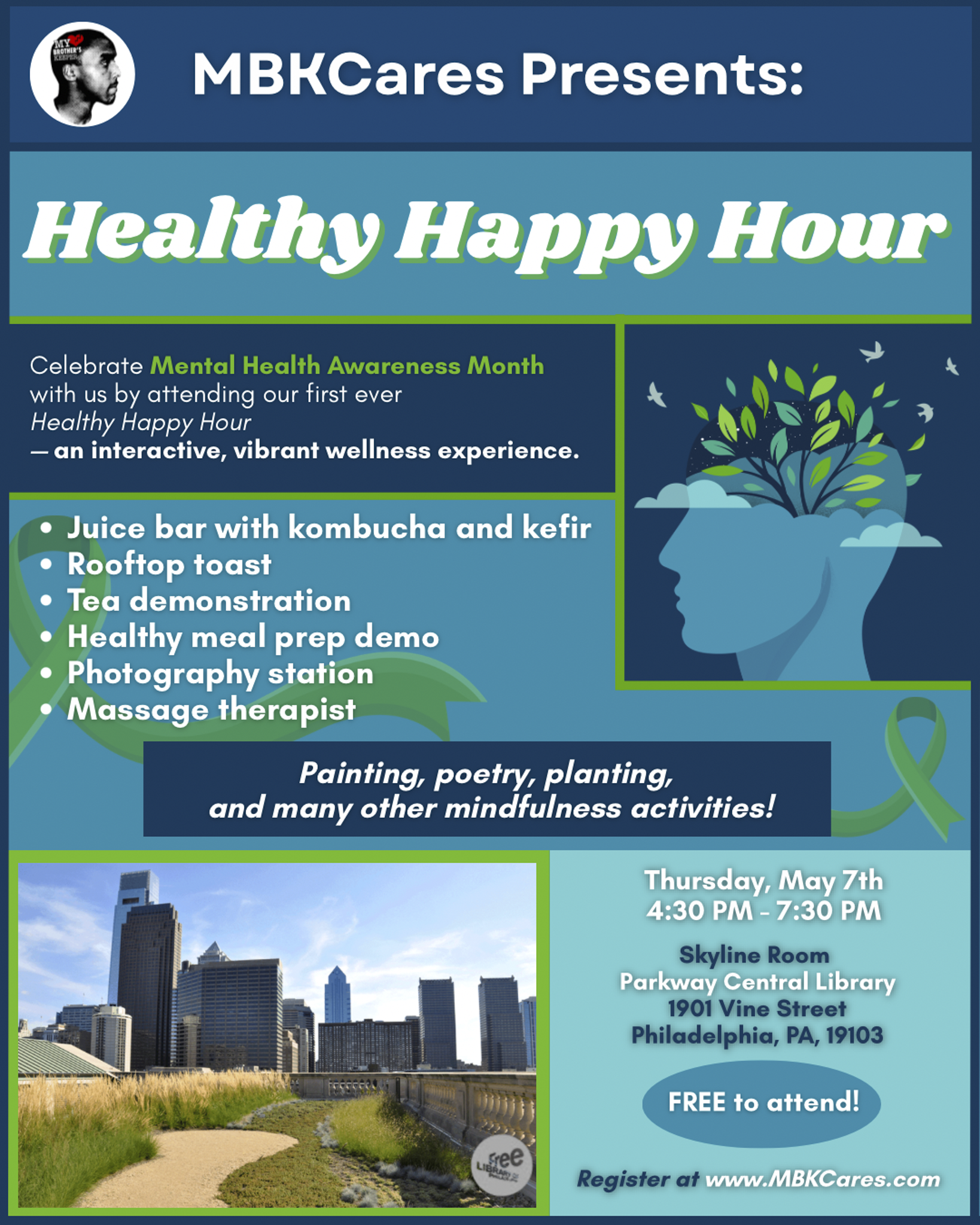 Parkway Central Library 1901 Vine Street (between 19th and 20th Streets on the Parkway), Philadelphia, PA, United StatesMBKCares is excited to launch Healthy Happy Hour, a new signature community event during Mental Health Awareness Month (May 2026). Experience an evening of wellness, creativity, and connection—without alcohol or smoking—including relaxing mini-massages, hands-on... Read more »